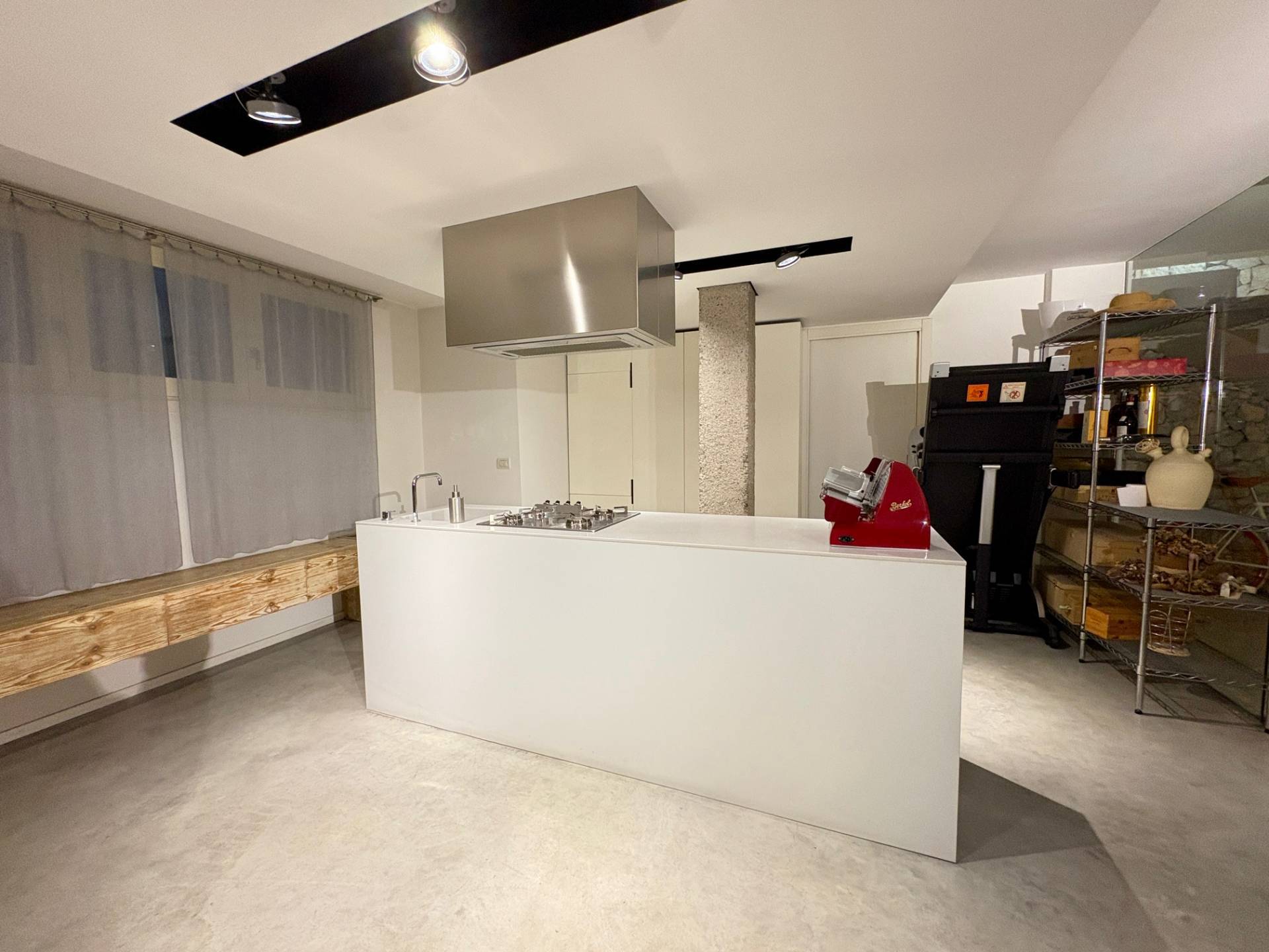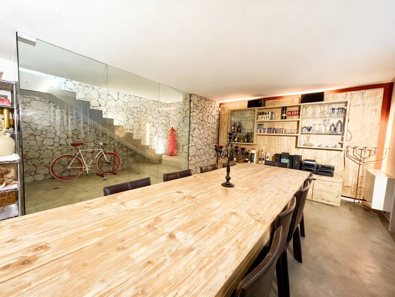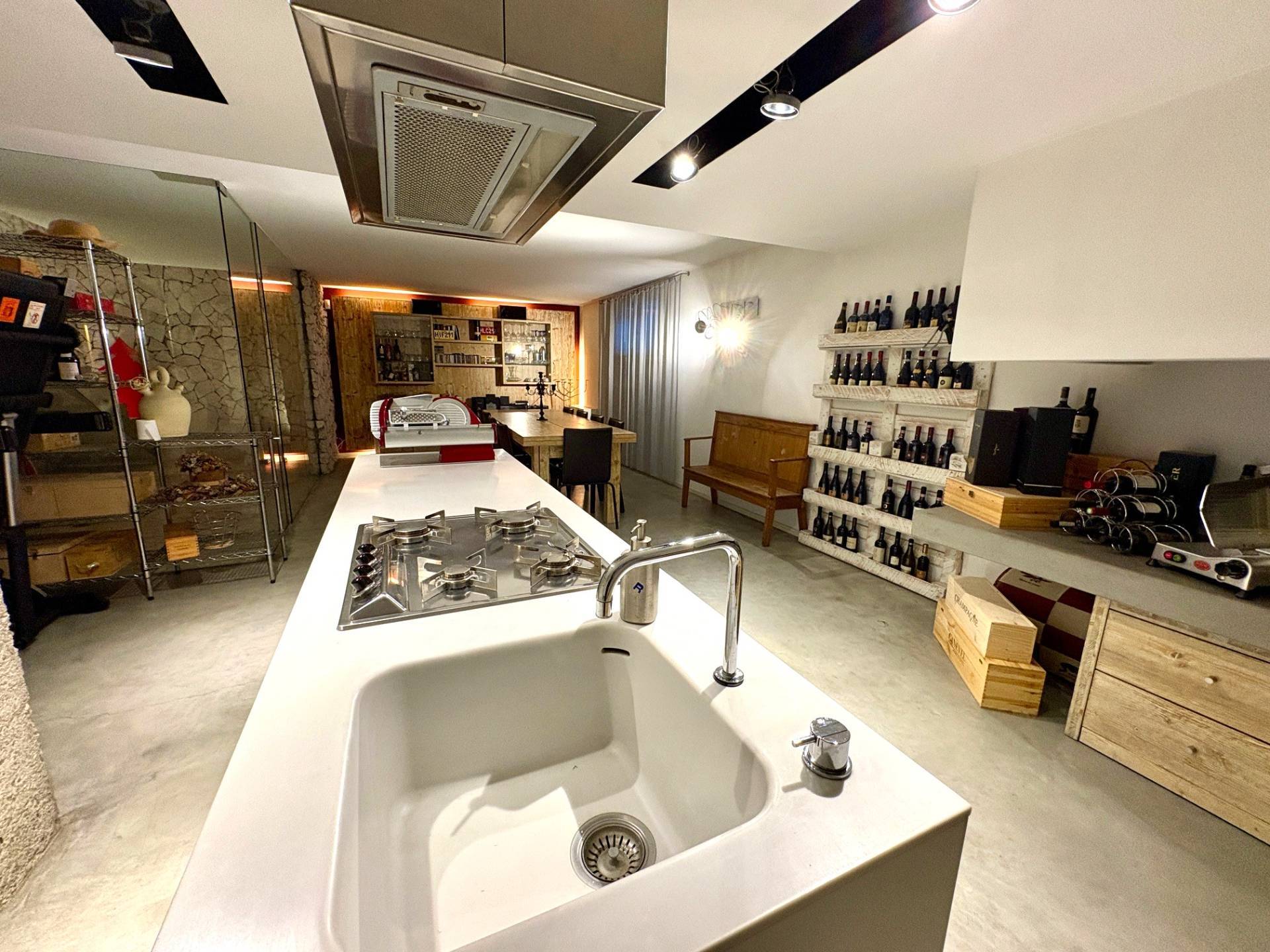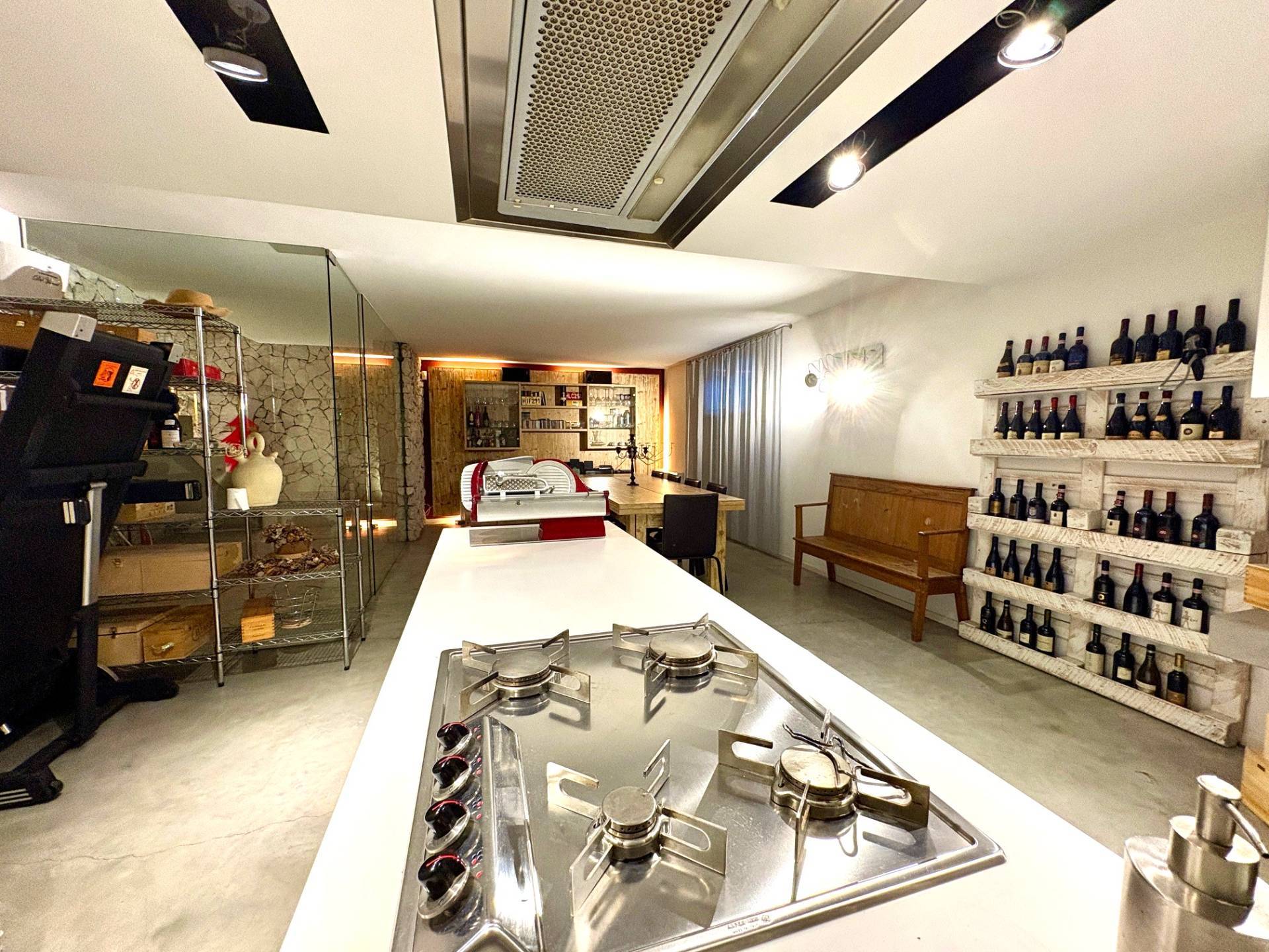 Nel Piano Interrato è stato creato un ambiente rivestito in Pietra e rifinito in Vetro, adattato ad uso Taverna di Lusso con cucina a Vista. Adatto a far vivere la famiglia e gli amici mantenendo privacy e tranquillità.