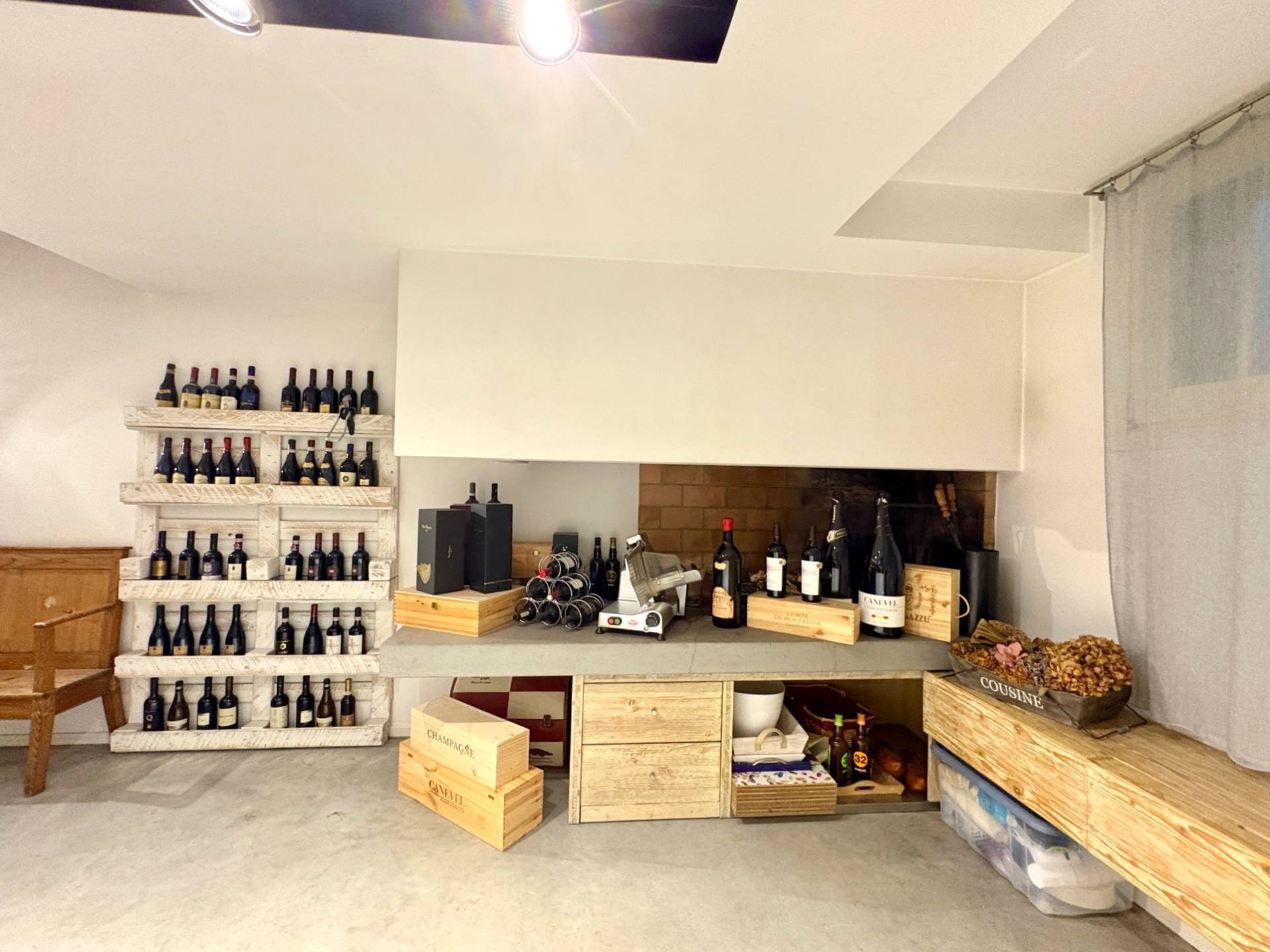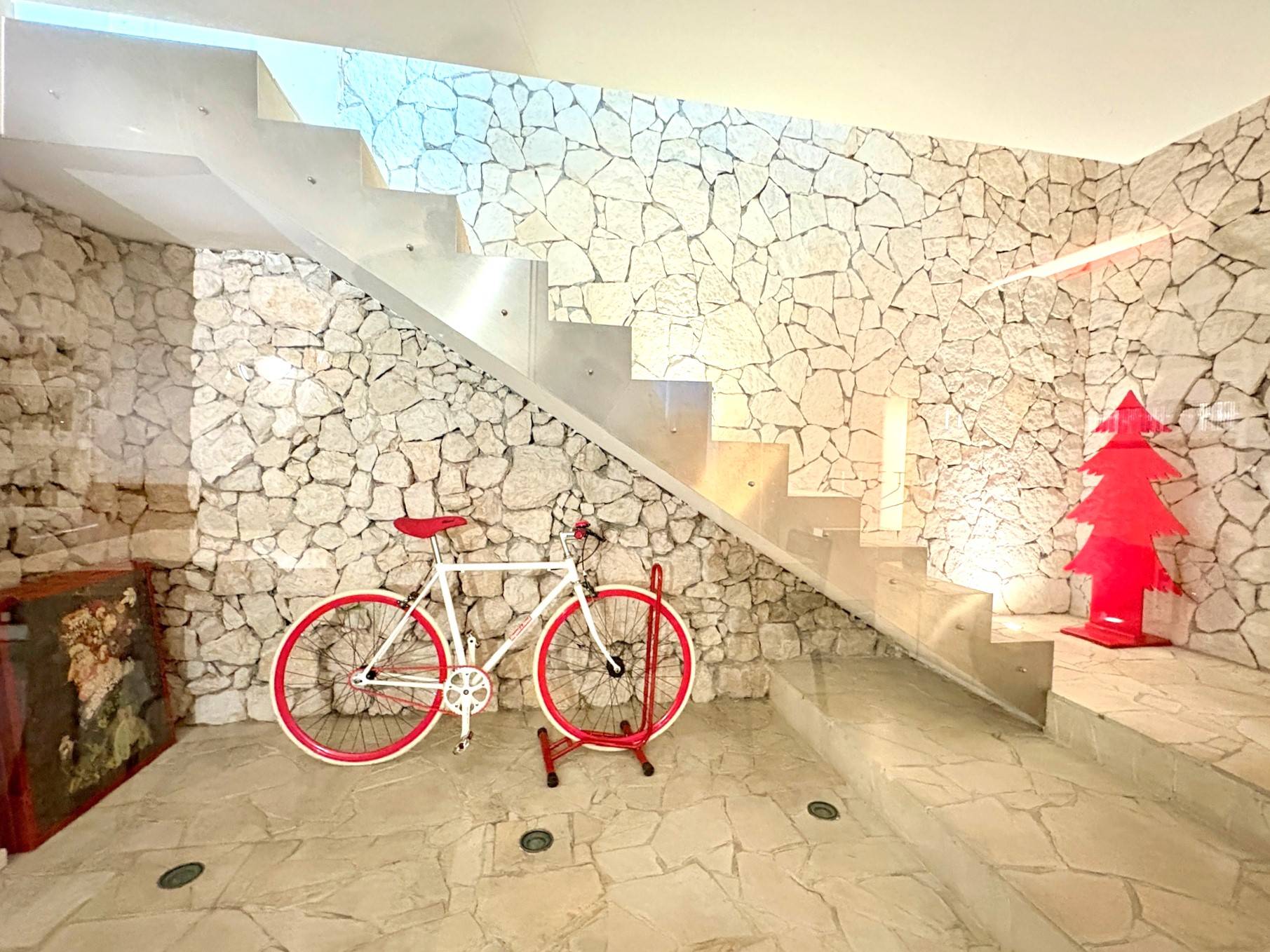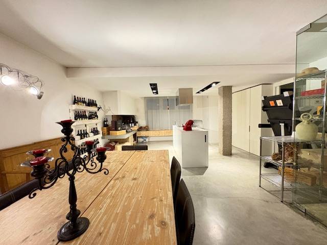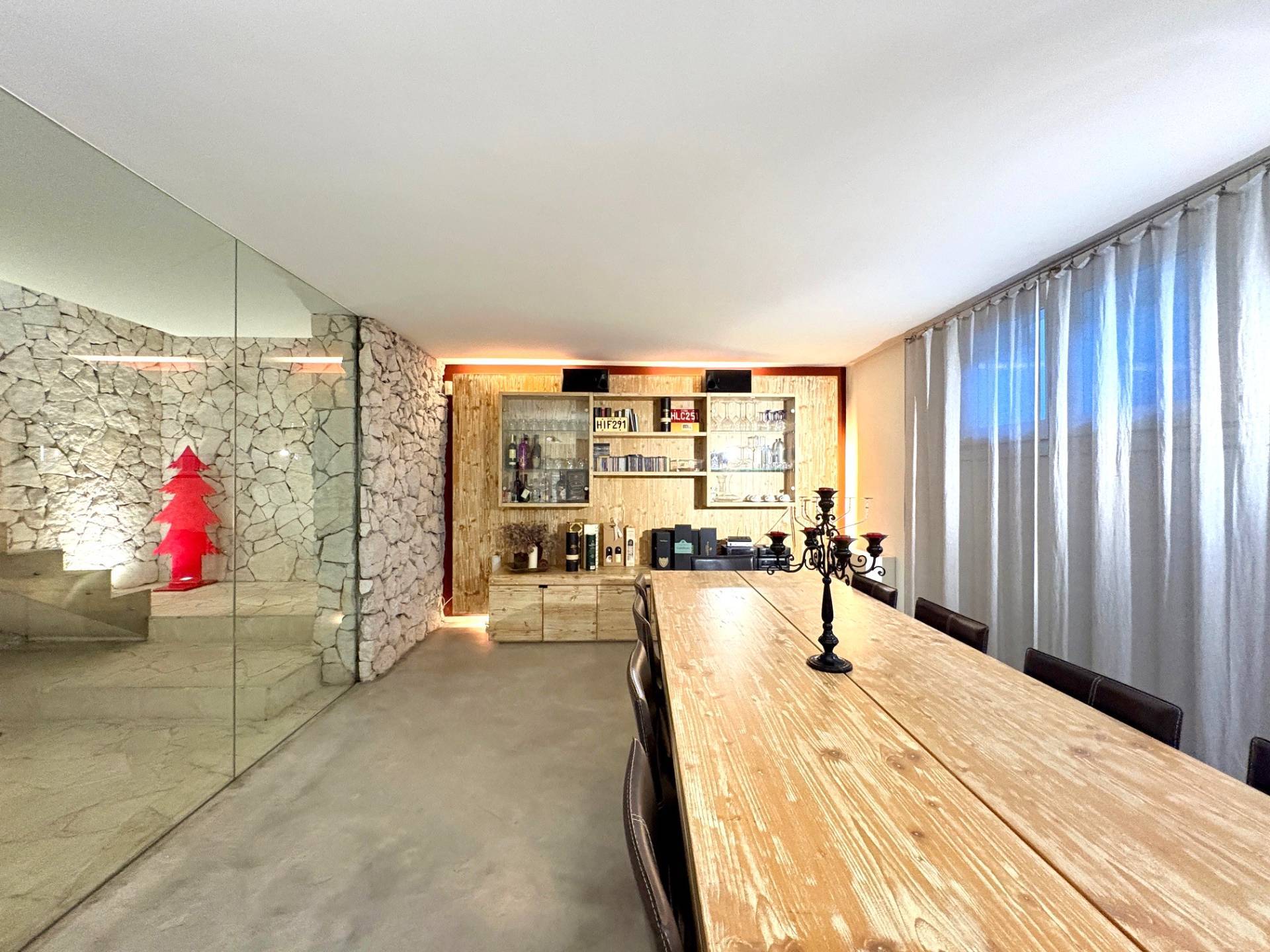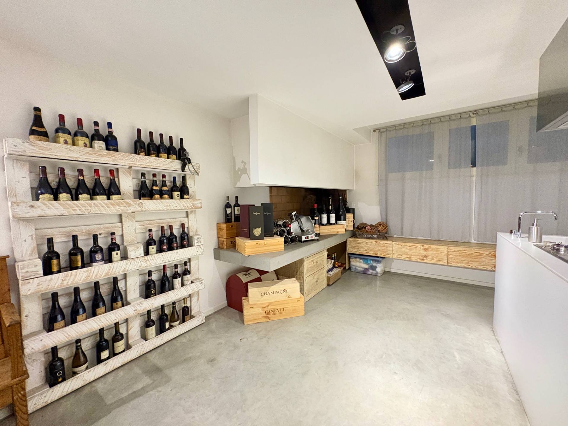 Nel Piano Interrato è stato creato un ambiente rivestito in Pietra e rifinito in Vetro, adattato ad uso Taverna di Lusso con cucina a Vista. Adatto a far vivere la famiglia e gli amici mantenendo privacy e tranquillità.