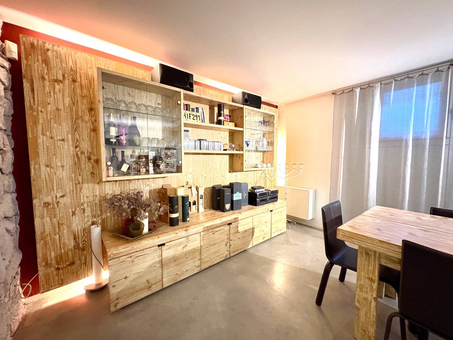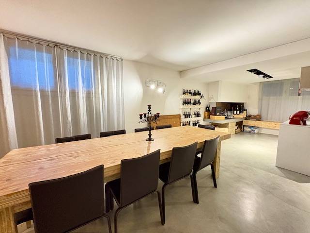 Il pavimento in legno e la pietra delle pareti caratterizzano l’intera zona giorno, creando un spazio elegante, caldo e moderno allo stesso tempo.