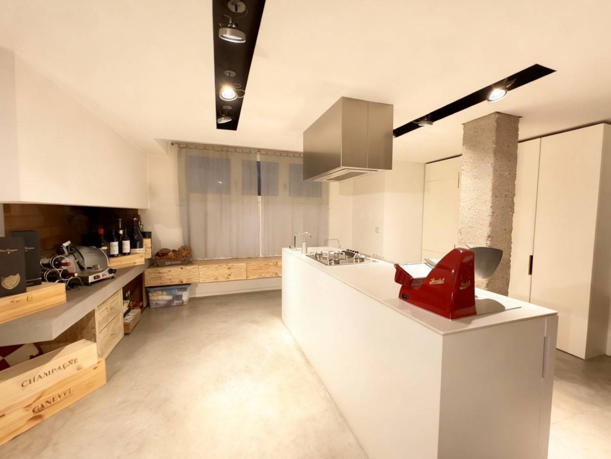 La cucina a vista, realizzata in legno e corian impreziosita da inserti in acciaio, è in armonia con lo stile dell’immobile.